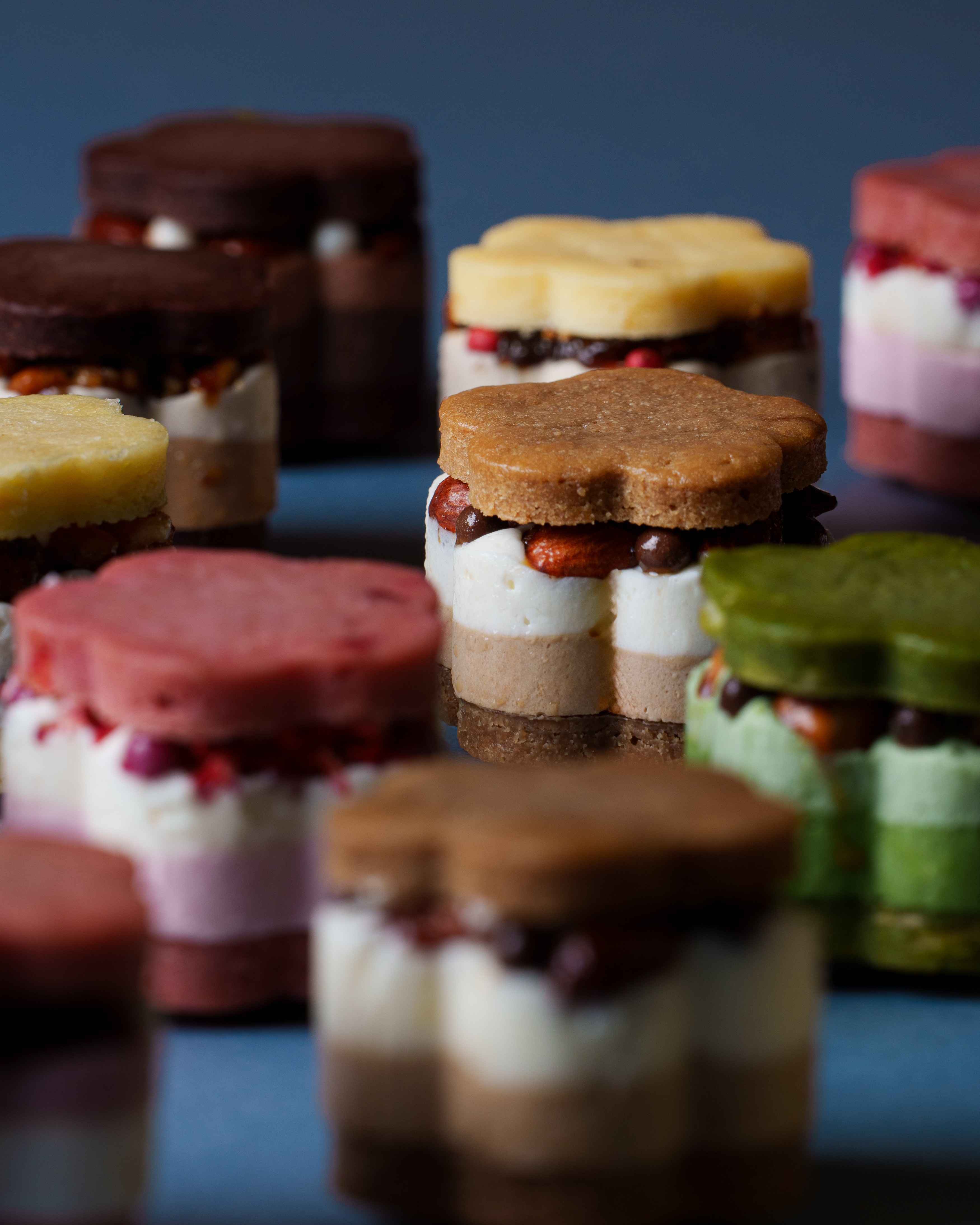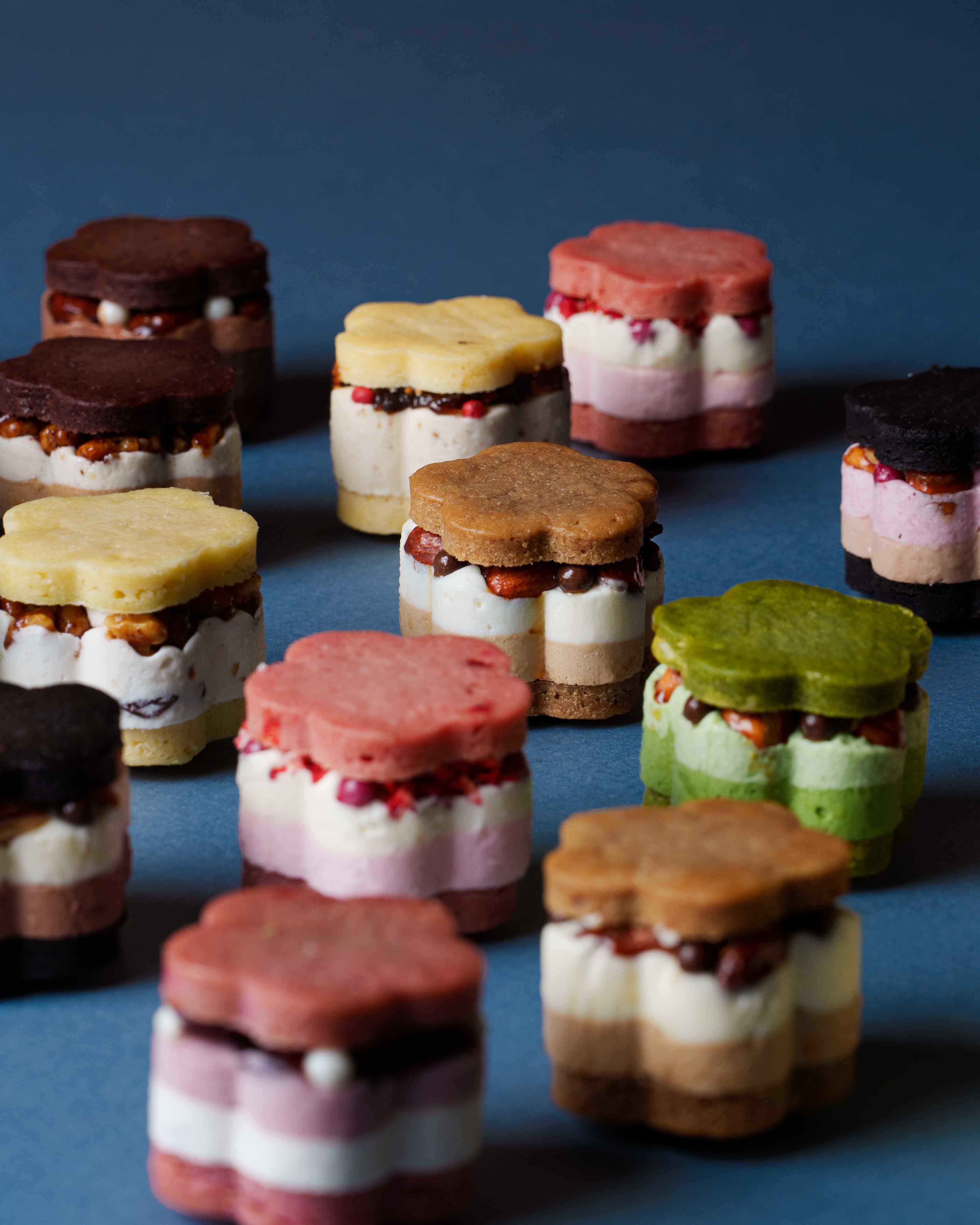 12種類のバターサンドからお好きな2種類をお選びいただき、それぞれ異なるフレーバーと食感を楽しめます。花型の可愛らしい見た目と繊細なバタークリームの層が、口の中で広がる至福の瞬間をもたらします。組み合わせ自由なので好みに合ったアレンジが可能です。