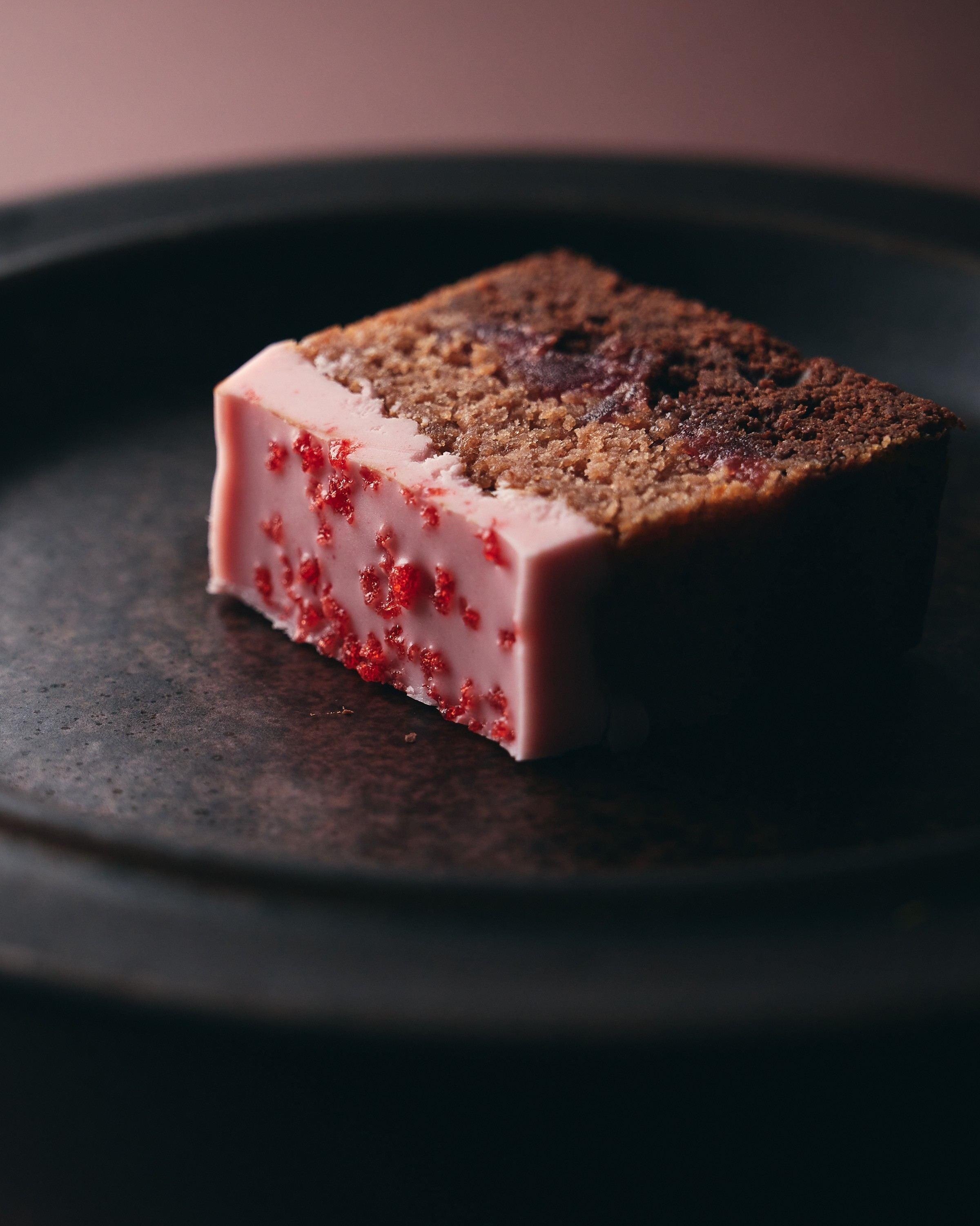 カカオ分66%のビターチョコレート生地に大粒のドライストロベリーを乗せ、その上にストロベリーチョコレート生地を重ねて焼き上げストロベリーチョコレートをコーティング。苺の甘酸っぱさとチョコレートの相性がとても良い一品です。