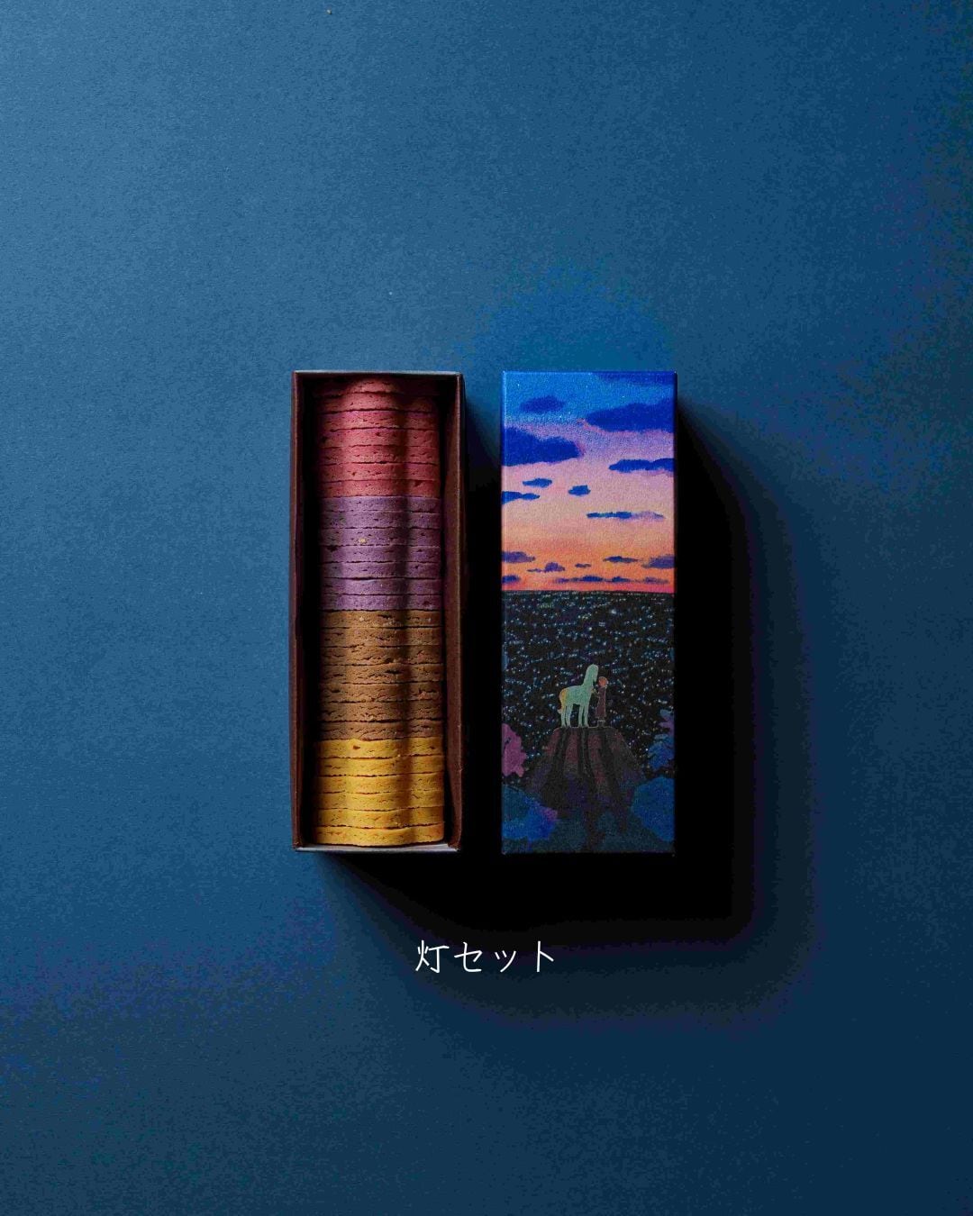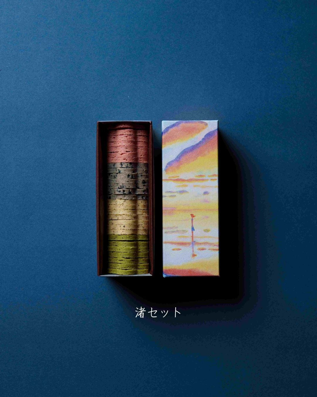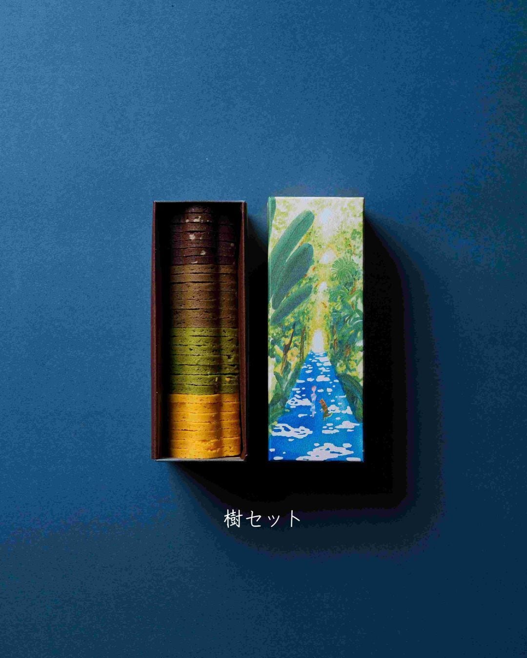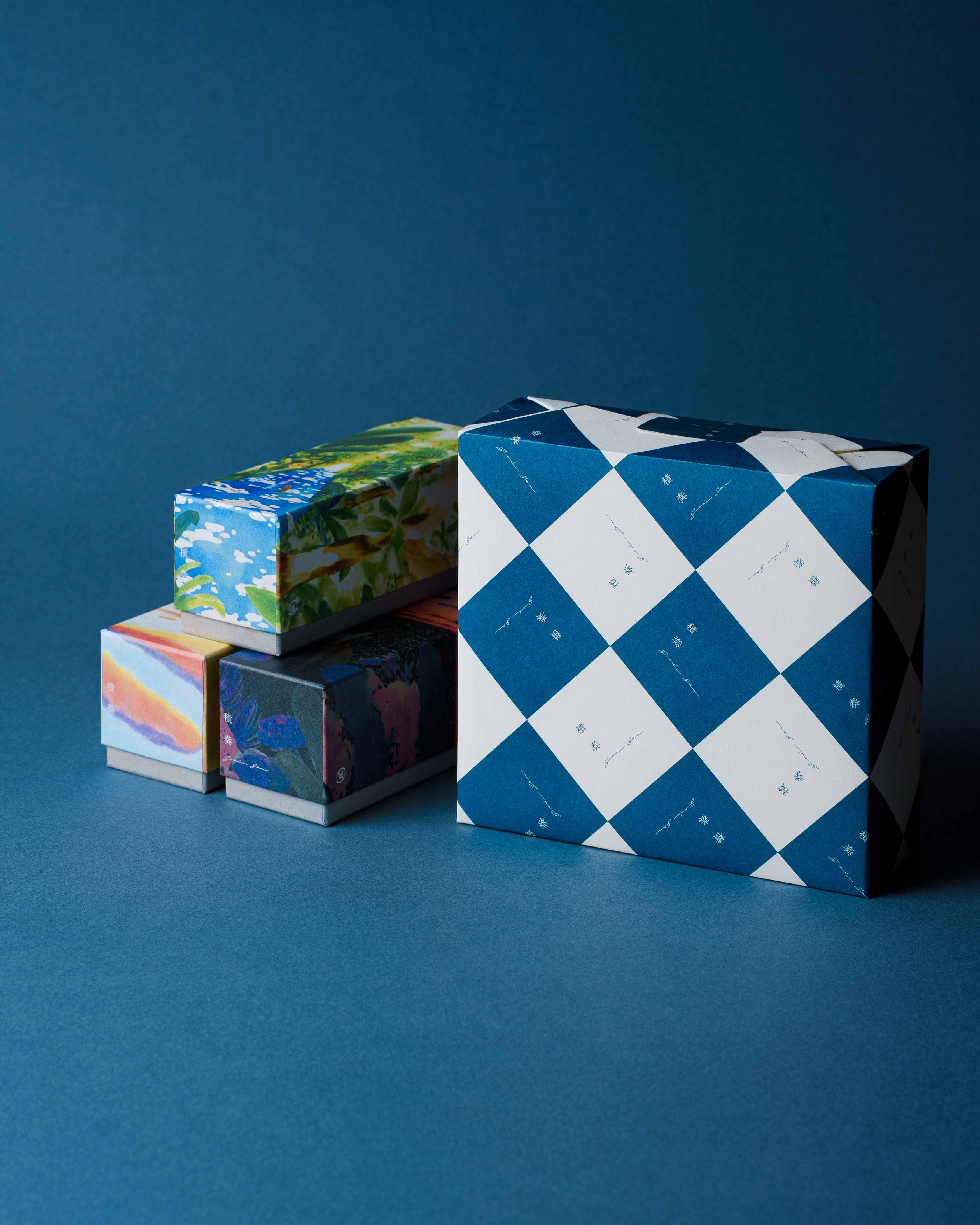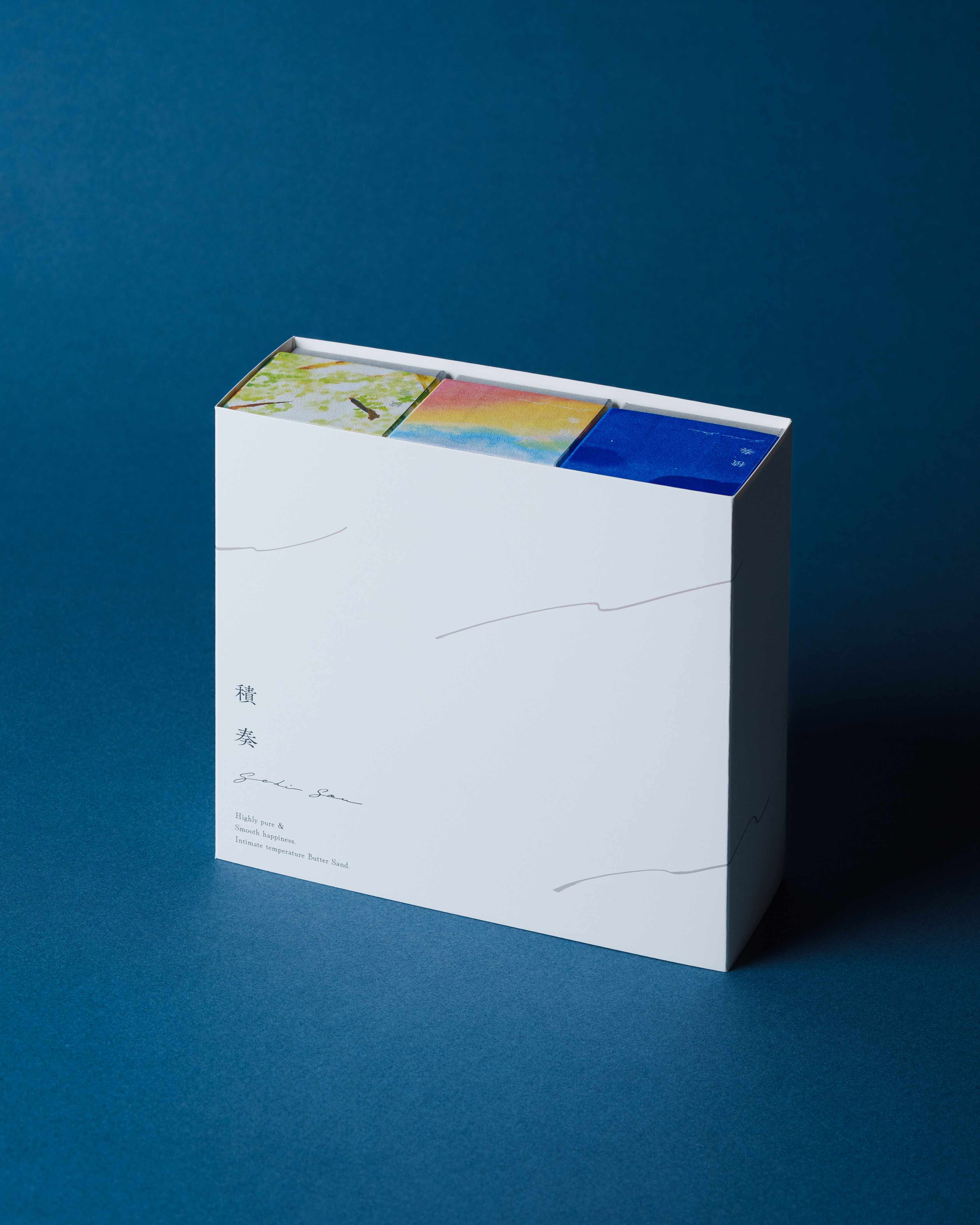 積奏サブレ全12種類(樹、渚、灯の3セット)をオリジナル特製ボックスに入れてお届けします。また、オリジナル特製ボックスを積み重ねて入れることができる紙袋を1つお付けいたします。