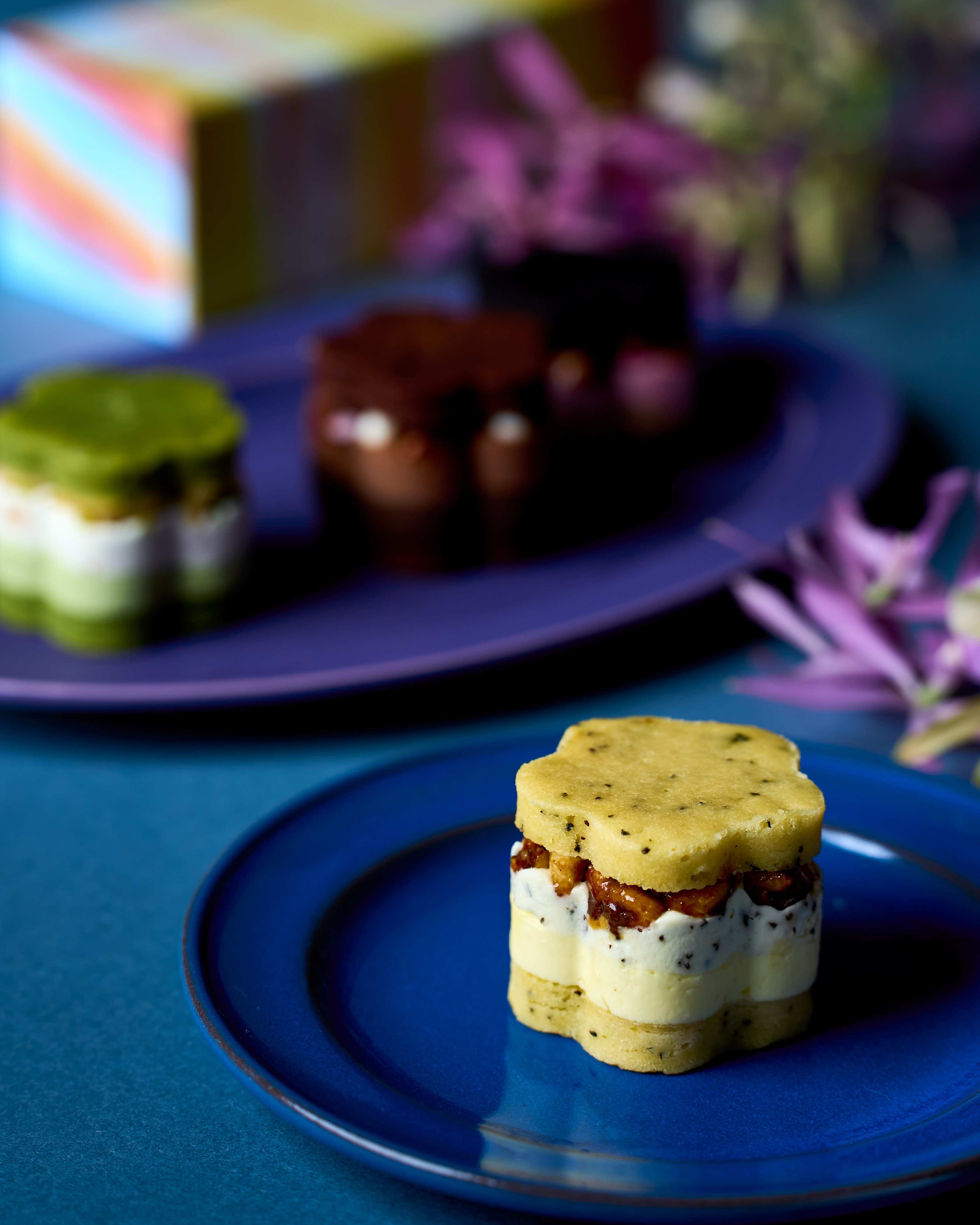 スリランカ産アールグレイ茶葉を練りこんだクリームと削りたてのレモンピールを練りこんだクリームを重ね、キャラメリゼしたクルミをトッピング。アールグレイサブレでサンドしました。
