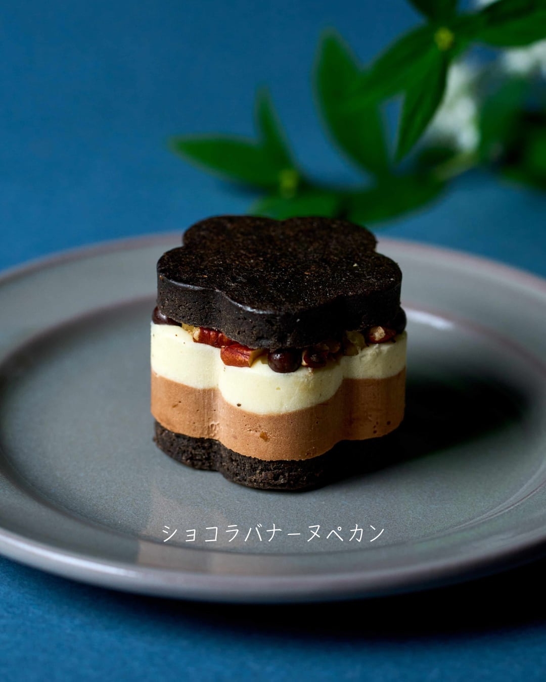 カカオ分66%のショコラクリームとバナナクリームを重ね、ローストしたピーカンナッツとパールショコラをトッピング。ブラックココアを練りこんだサブレでサンドしました。
