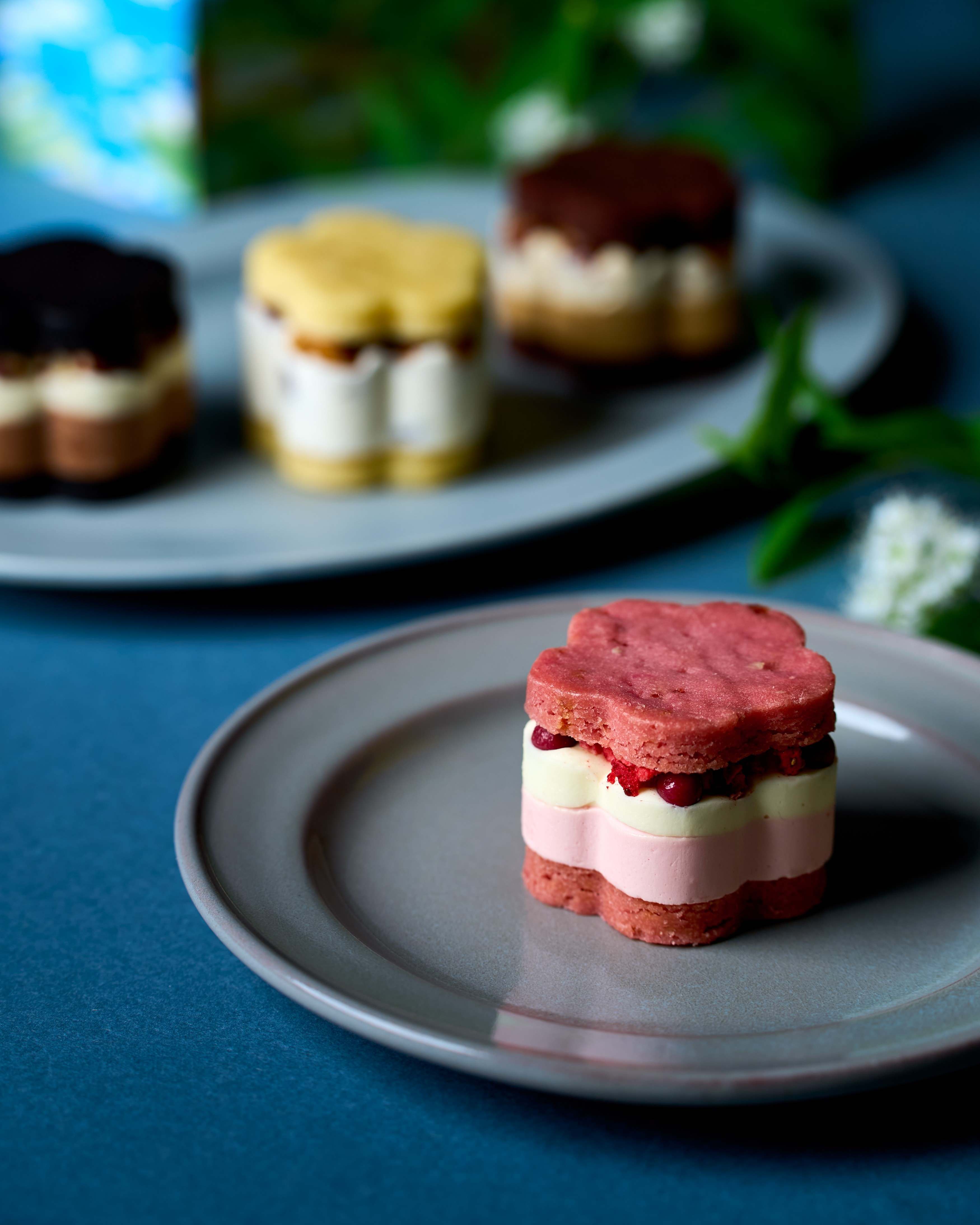 ストロベリーパウダーを混ぜ込んだクリームにホワイトショコラクリームを重ねフリーズドライストロベリーとラズベリーパールショコラをトッピング。ストロベリー顆粒を練りこんだサブレでサンドしました。