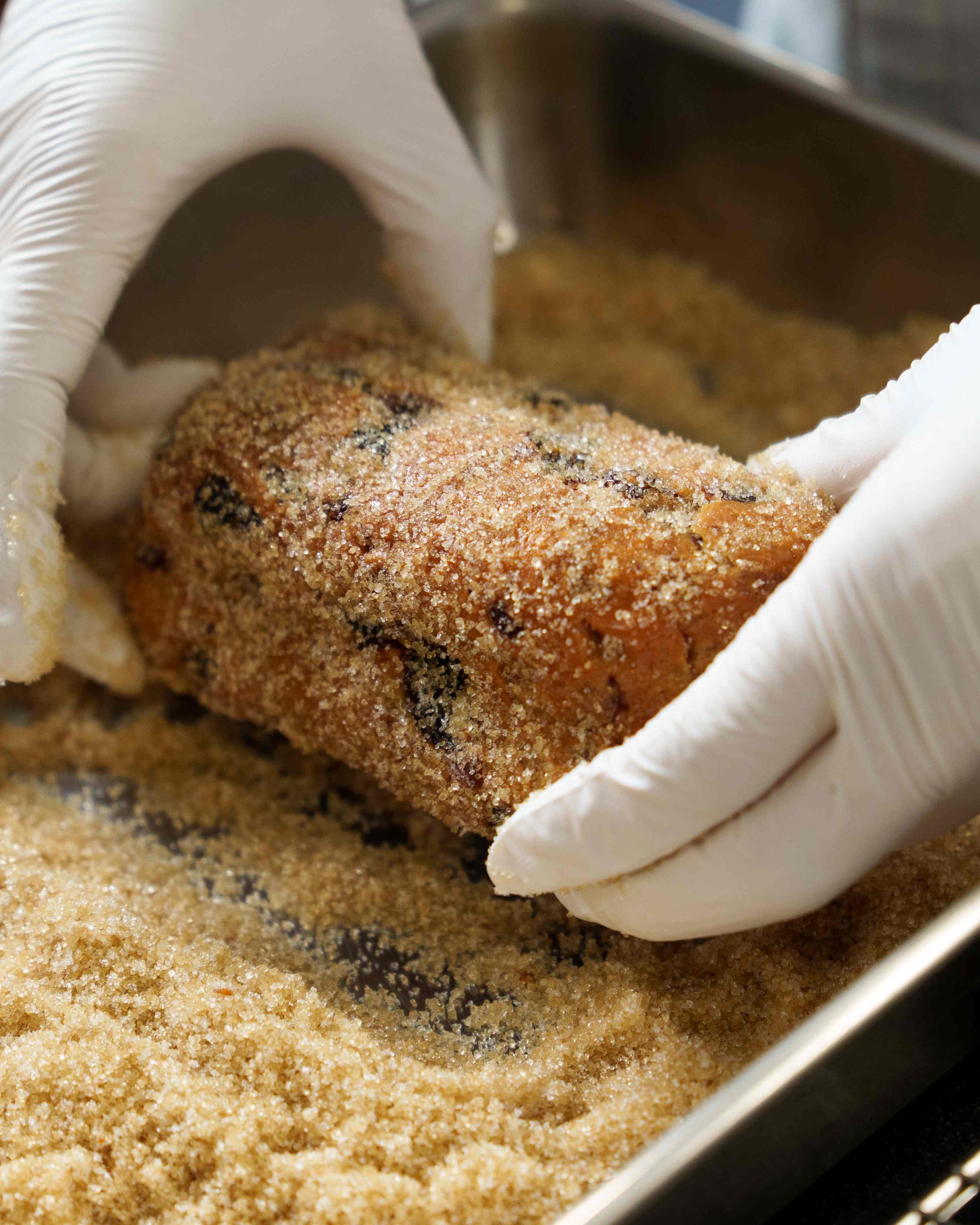 その後、まず「カソナード」というフランスの粗糖をしっかりとコーティングさせて-1℃の冷凍庫で24時間熟成させます。
