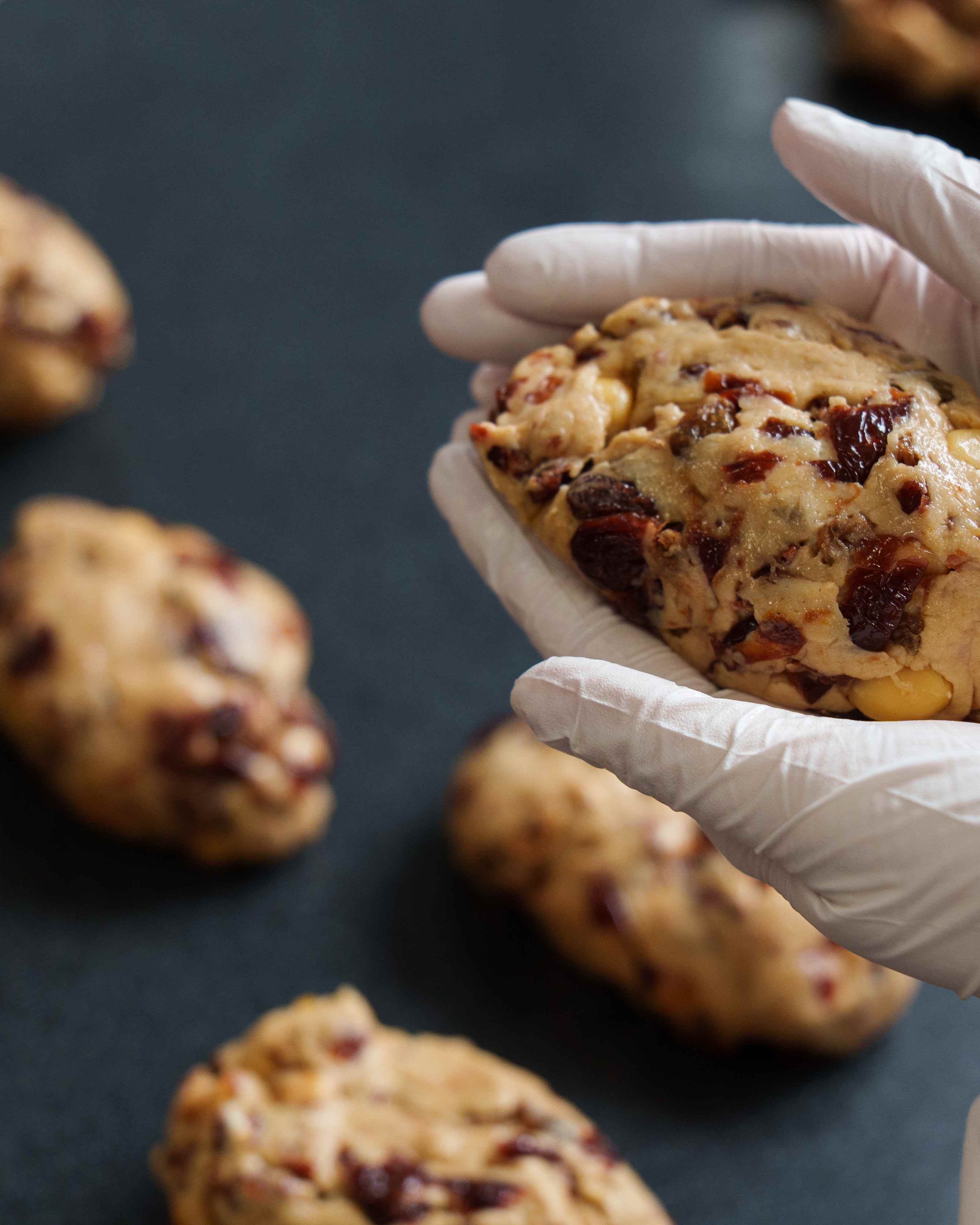 生地を仕込む1時間前に、ローストしたマカダミアナッツと、キャラメリゼしたヘーゼルナッツをドライフルーツと合わせておきます。この下処理をすることで生地の水分をナッツに奪われることなく、とてもしっとりした生地になります。また、一般的にはあまり使われることの無い、キャラメリゼしたヘーゼルナッツを混ぜ込むことで、生地内部のコクも増しました。